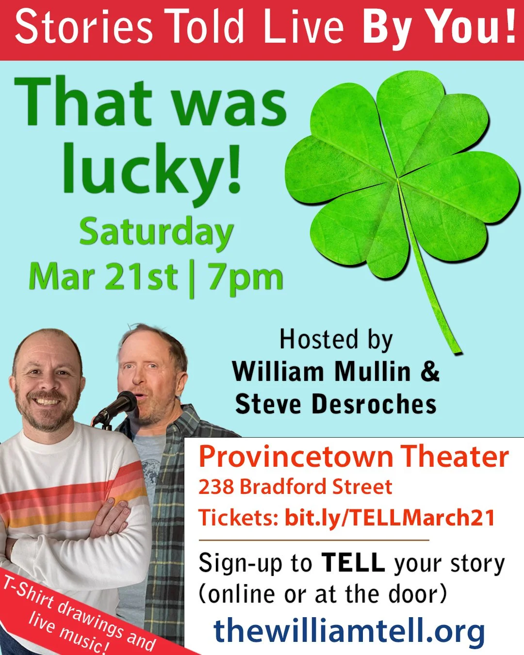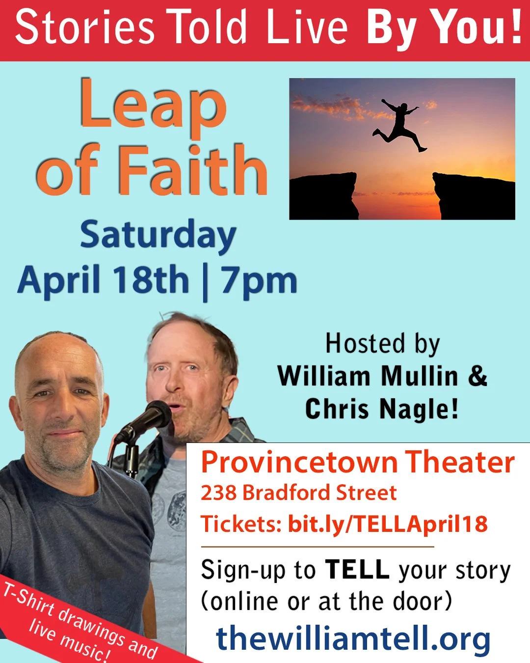 The TELL is a live storytelling show on Cape Cod, hosted by storyteller, comedian, and writer, William Mullin. Each show features 6 storytellers, who TELL 7-minute true stories based on the night’s theme. Each show features live music and giveaways from our sponsors. If you want to TELL your story with us, fill out the TELL with us form or come to the show at 6:30pm to sign up the day of!